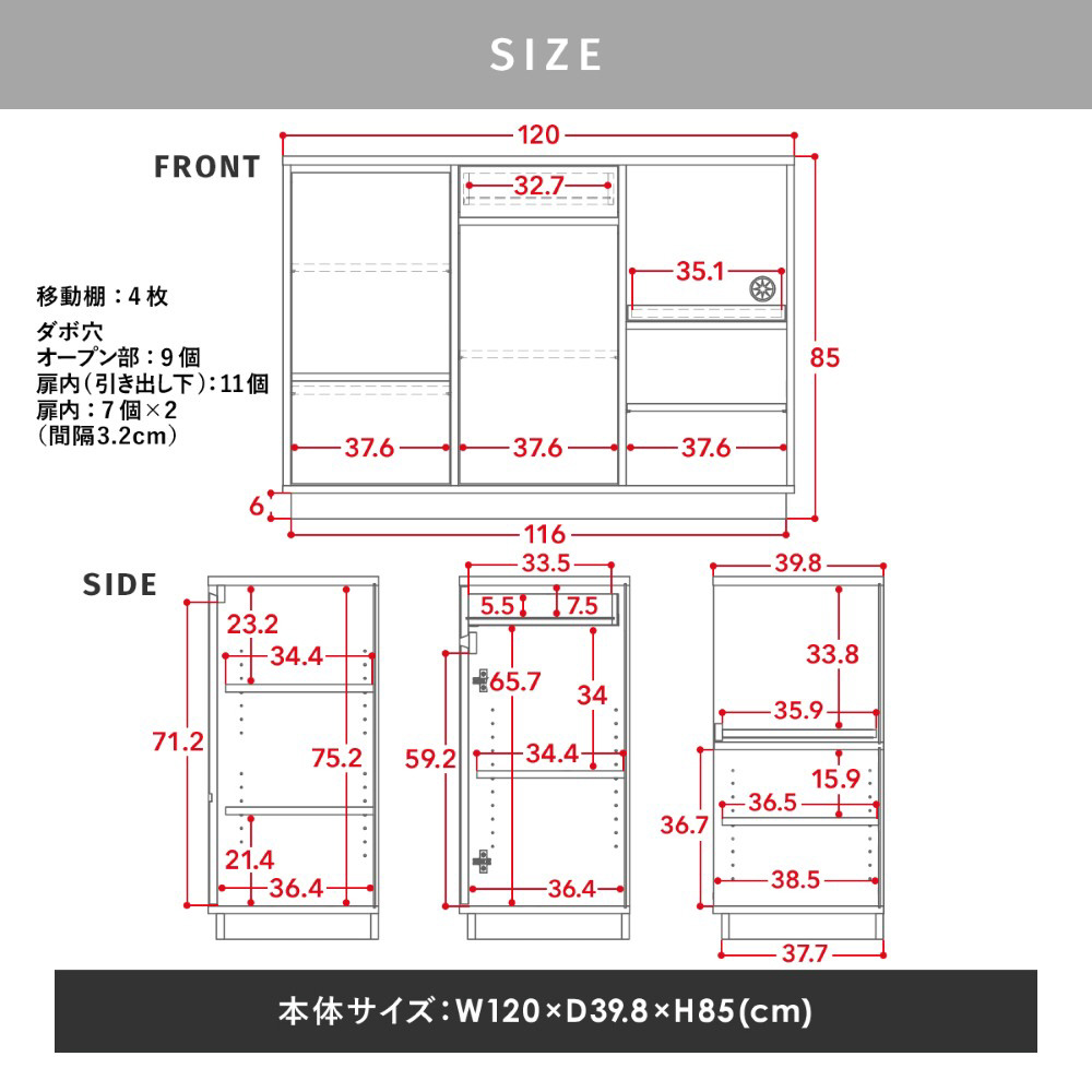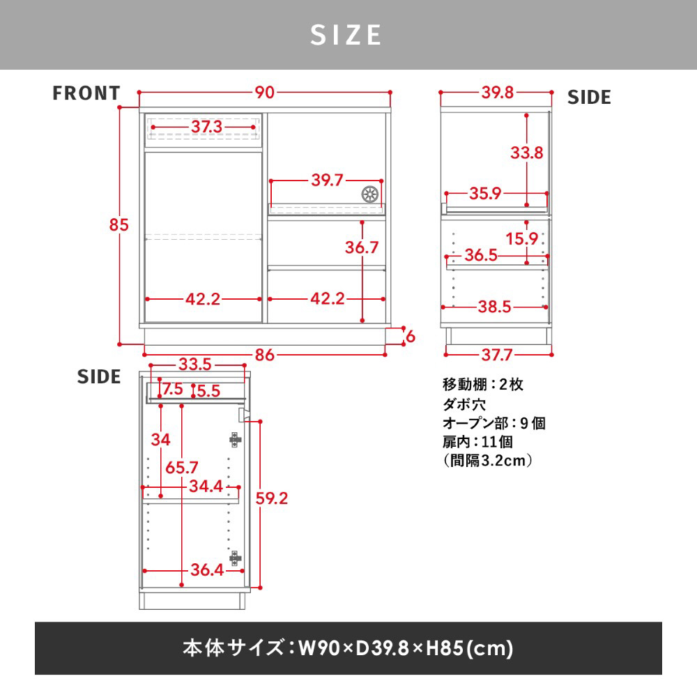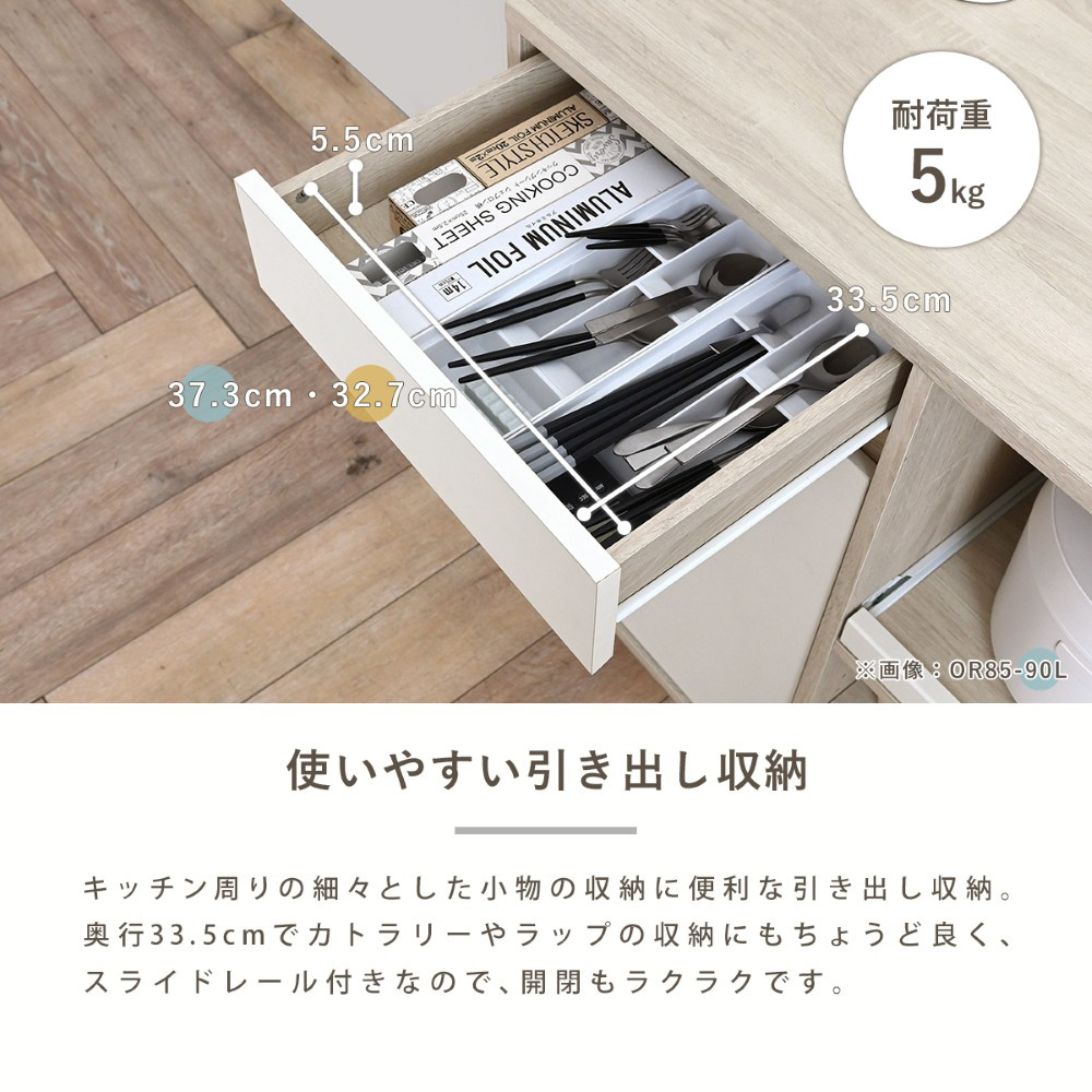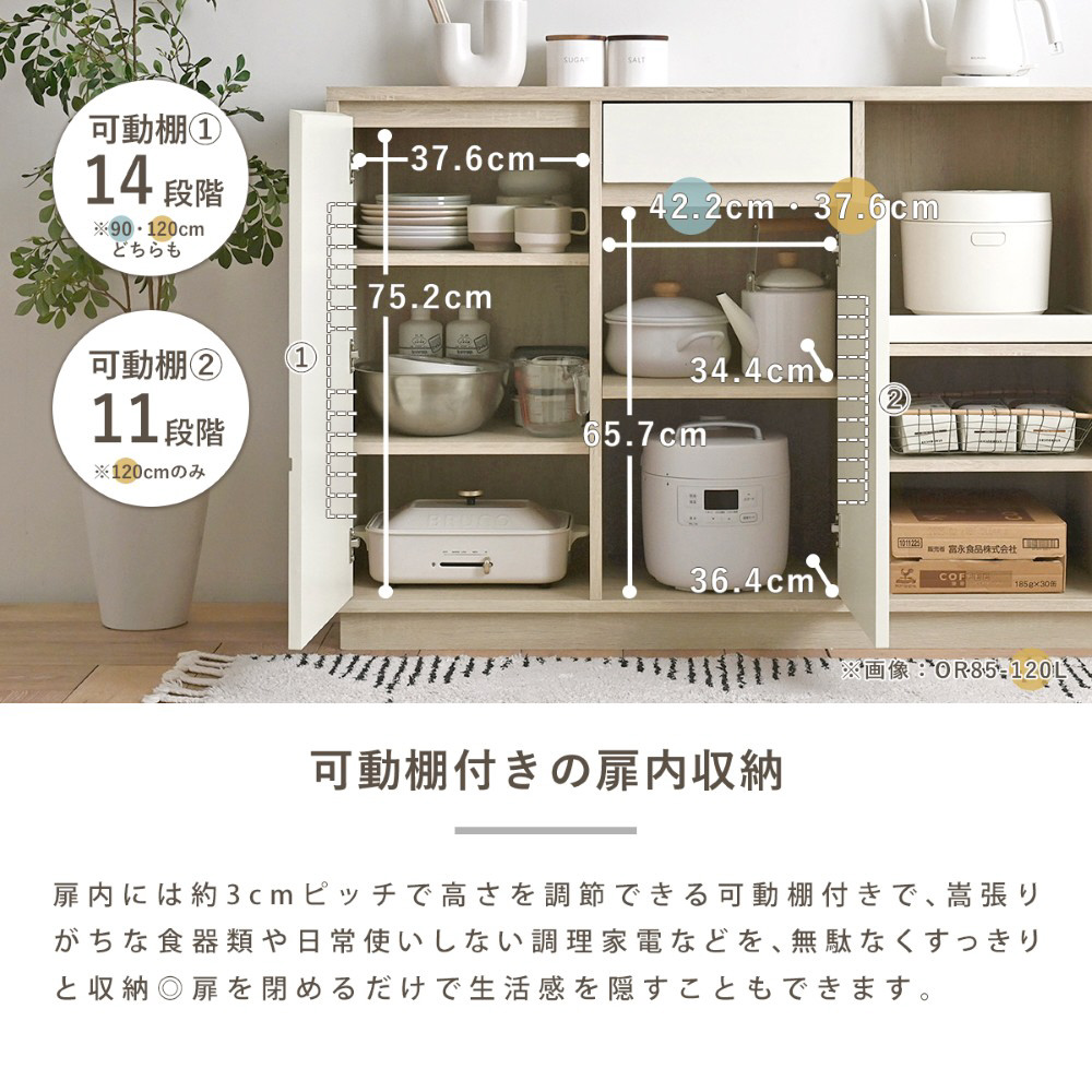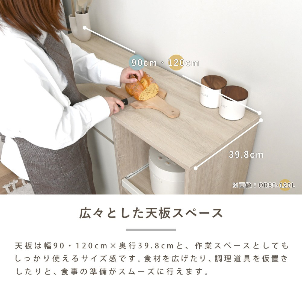 一人暮らしにぴったりのコンパクトな幅90cmと、収納力がアップしたワイドな幅120cm。天板高はどなたでも使いやすい高さ85cmの快適設計。奥行きも39.8cmと圧迫感を感じさせないサイズ感で、作業台やカウンターとして、毎日の家事をサポート。
