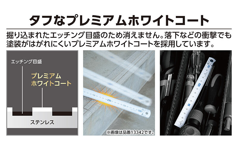 タフなプレミアムコートで掘り込まれたエッチング目盛のため消えません。落下などの衝撃でも塗装がはがれにくいプレミアムホワイトコートを採用しています。