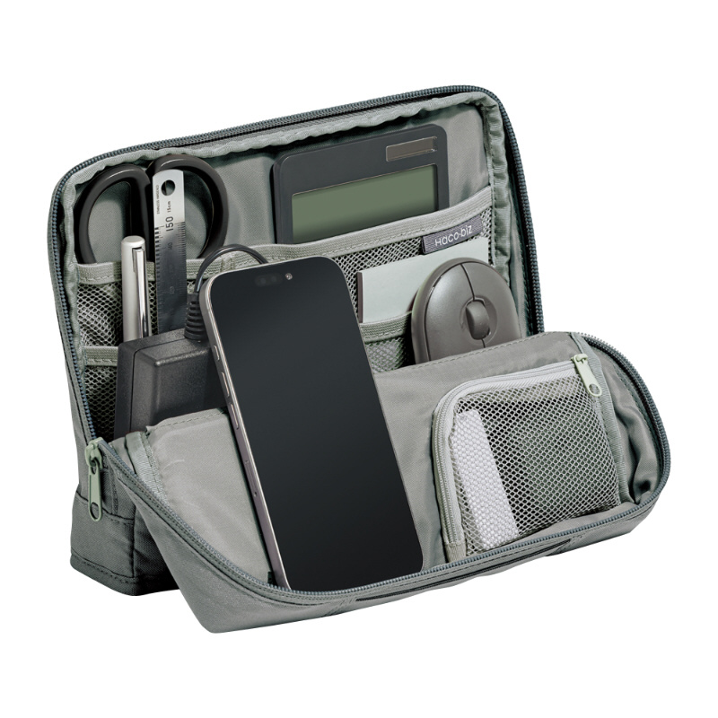 ハサミやペンなどの文具類からマウスやACアダプタなどのガジェット類のワークツールをコンパクトに収容できる