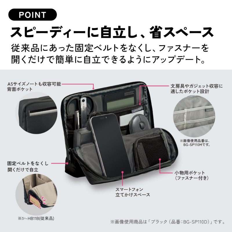 従来品にあった固定ベルトをなくし、ファスナーを開くだけで簡単スピーディーに自立させることができるように構造をアップデート。