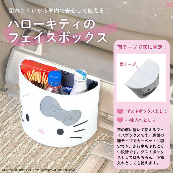 お車の床に置いて使用するハローキティのフェイス型ダストボックスです。