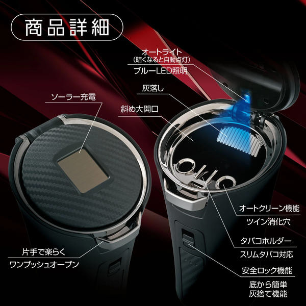 暗くなると点灯、明るくなると消灯するオートライト機能のブルーLED照明がついたソーラータイプの灰皿です。