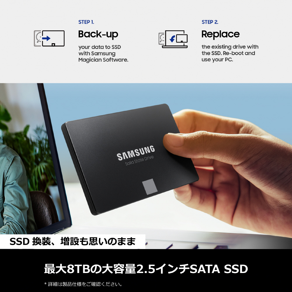 一般的な2.5インチSATAフォームファクタをサポートするパソコンをお使いの方なら、870 EVOへの換装が可能です。Samsung Magician ソフトウェアを使用すれば、面倒なデータ移行も簡単に行えます。