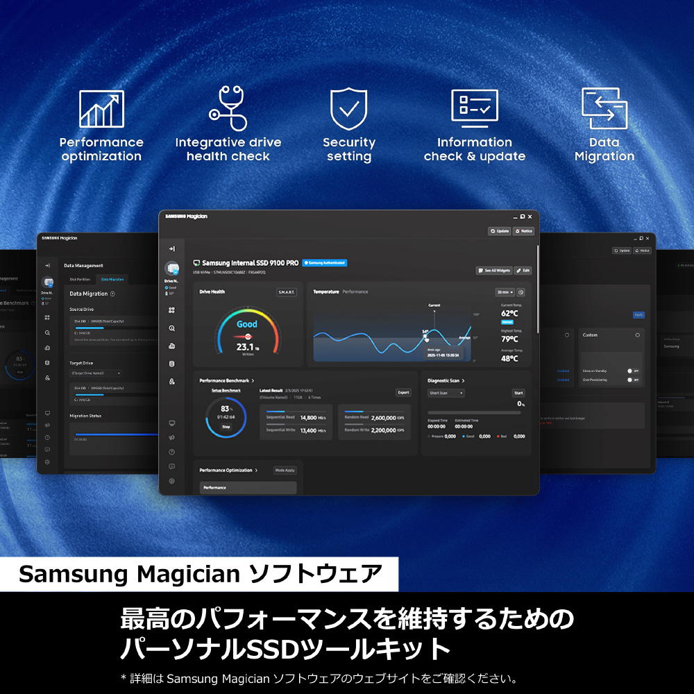 * Samsung Magician ソフトウェアは、以下のOSに対応しています。Windows(R) 10 以降、macOS(R) High Sierra (10.13.6)以降、Android(TM)5.1 (Lollipop)以降。旧バージョンのOSには対応していない場合があります。