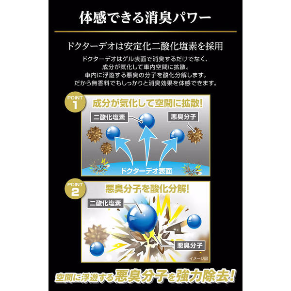 ドクターデオはゲル表面で除菌・消臭するだけでなく、成分が気化して車内空間に拡散。