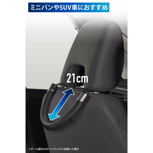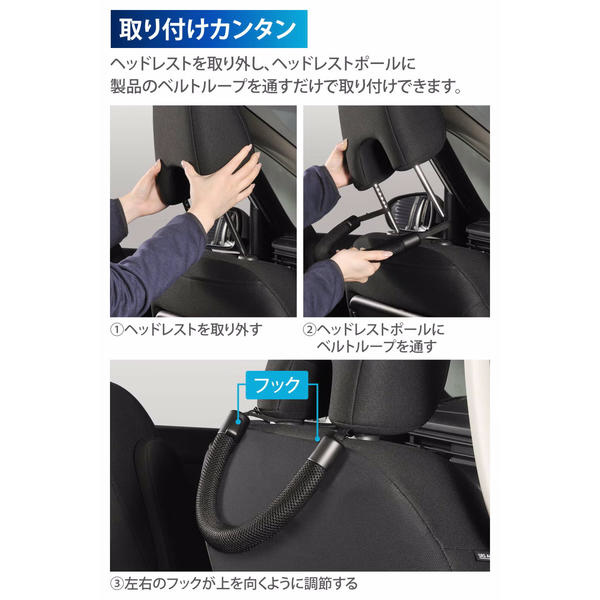 ヘッドレストを取り外し、ヘッドレストポールに製品のベルトループを通すだけで取り付けができます。誰でも1分ほどで取り付けることができます。
