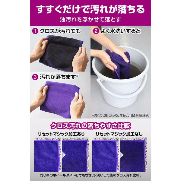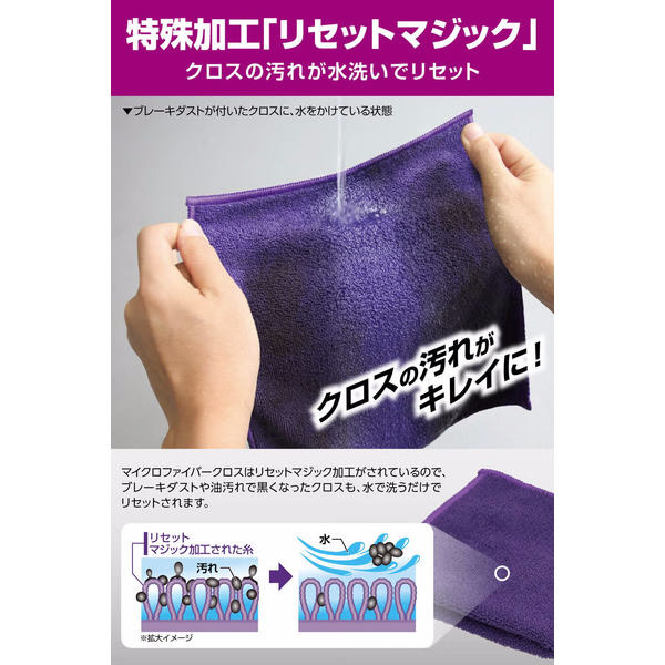 マイクロファイバークロスにリセットマジック加工がされているので、ブレーキダストや油汚れで黒くなったクロスも、水で洗うだけでリセットされます。