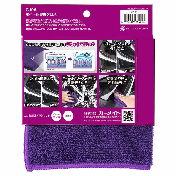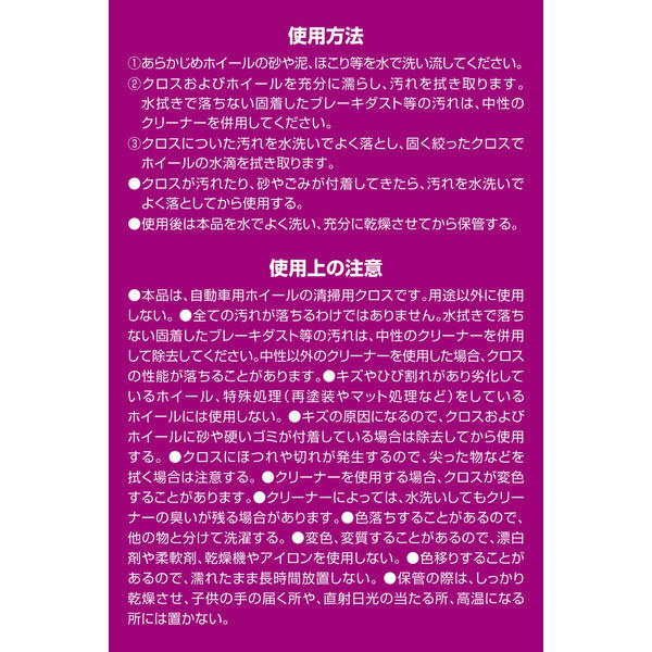 ・本品は、自動車用ホイールの清掃用クロスです。用途以外に使用しない。