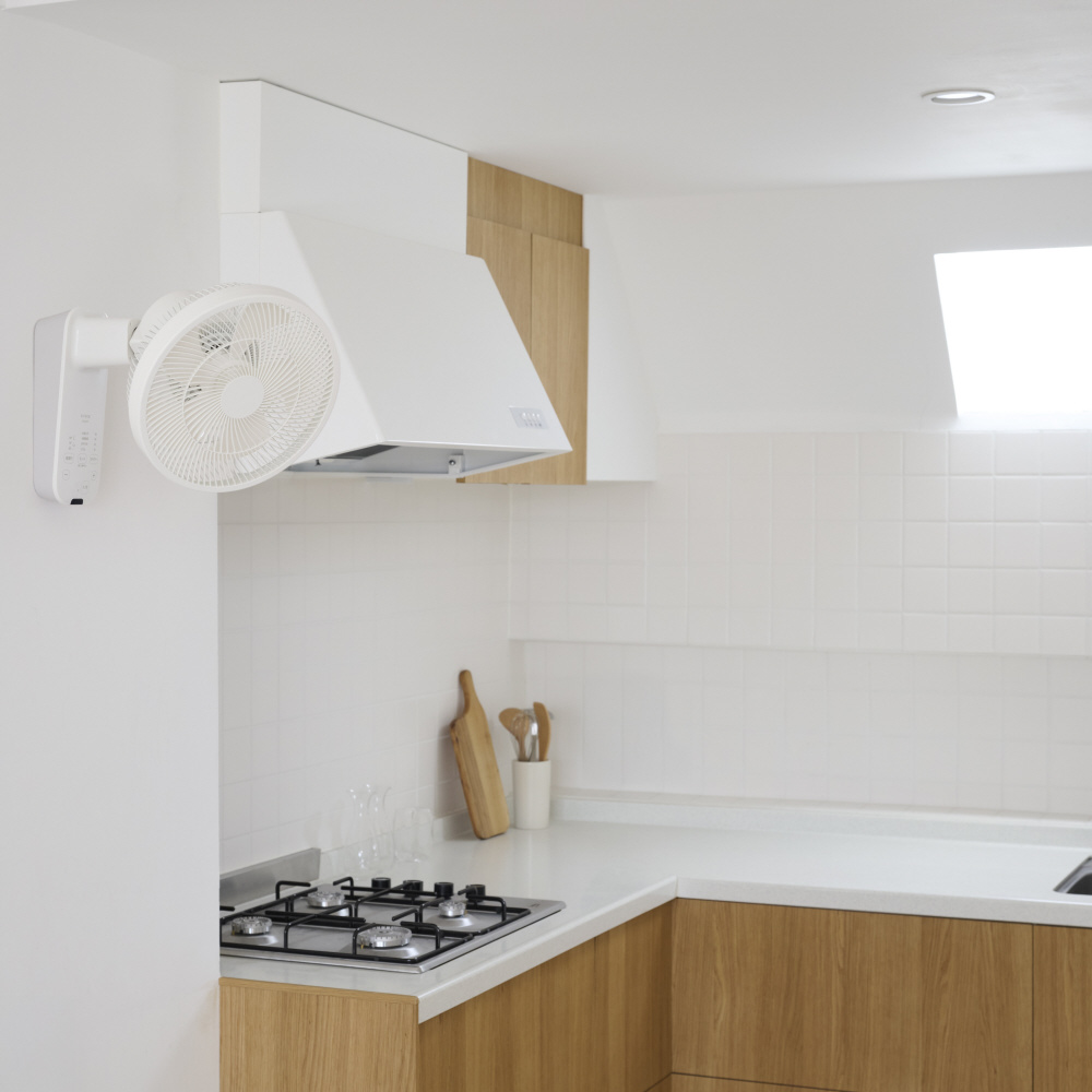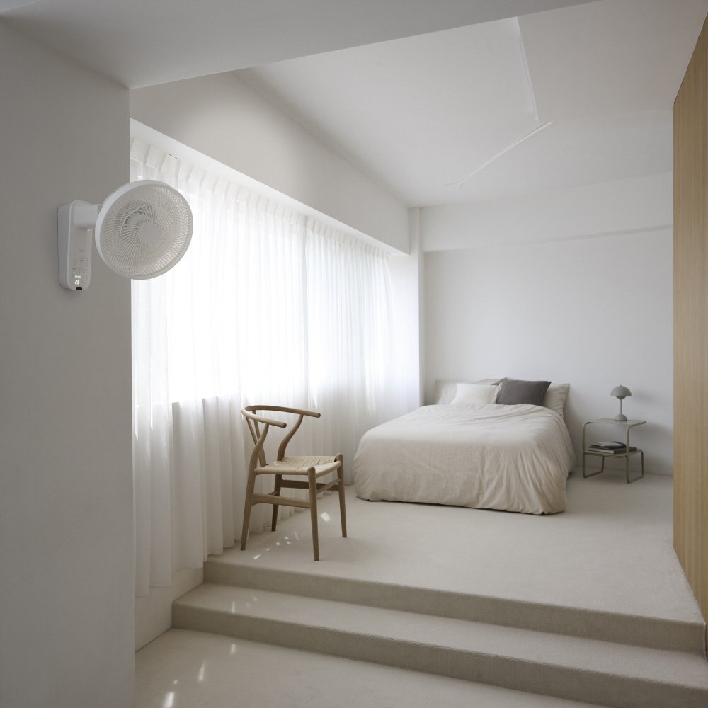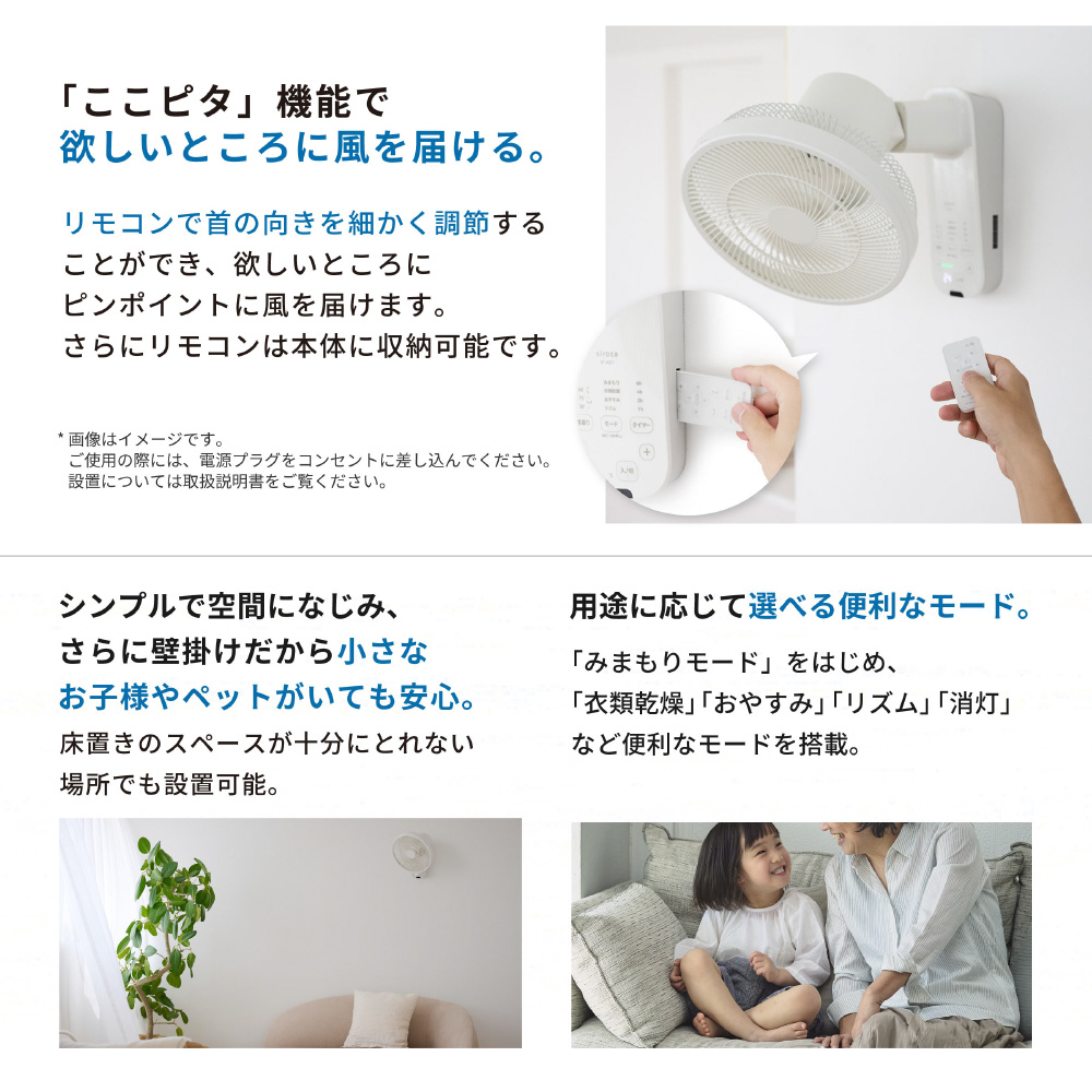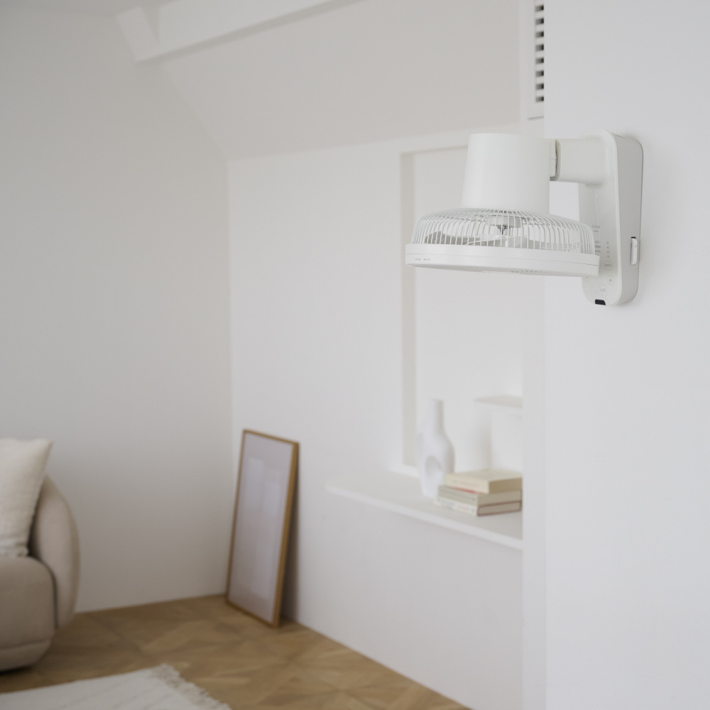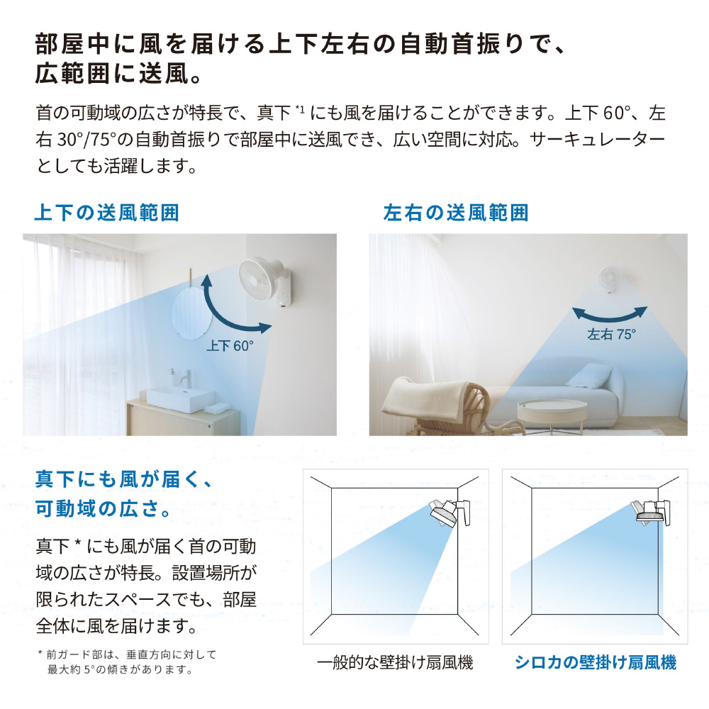 真下にも風が届く広範囲の首振りで、お部屋のすみずみまで送風できる壁掛け扇風機「壁掛けふわビューン」