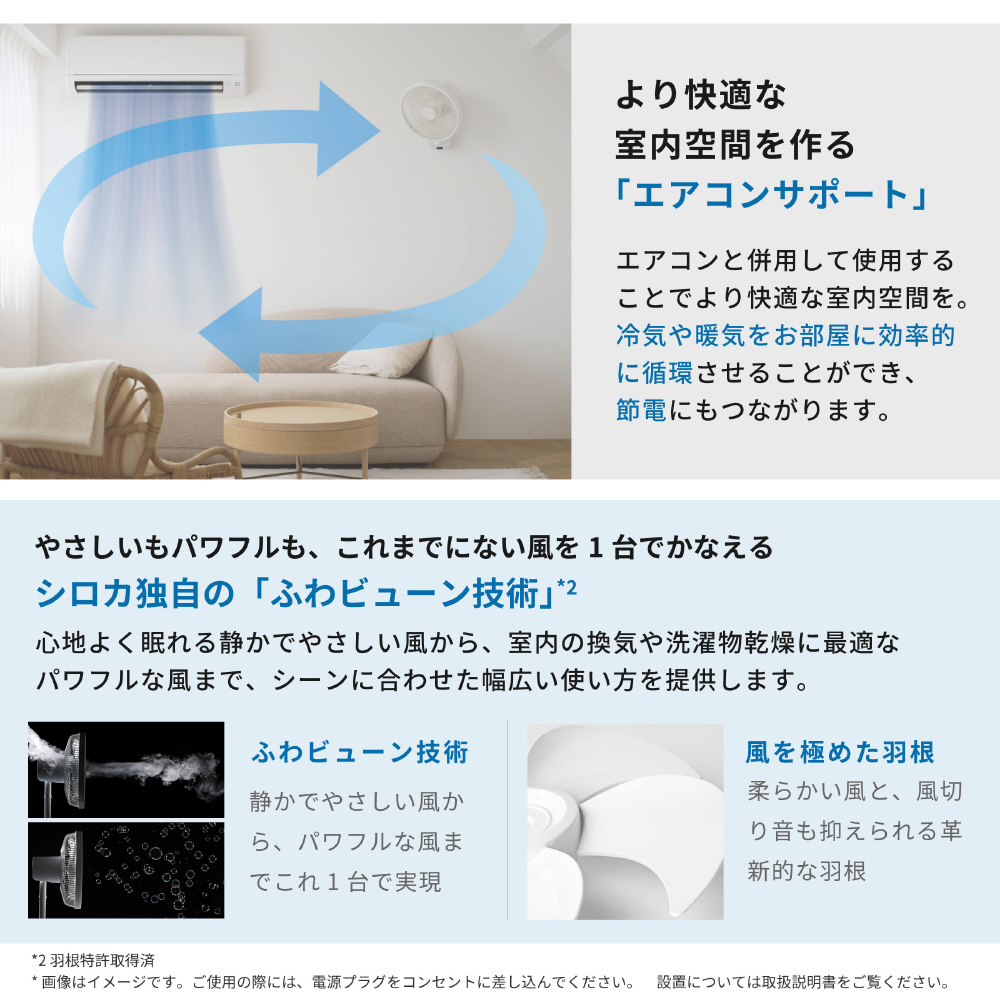 羽根・ガード・モーターを組み合わせたシロカ独自の特許技術により、睡眠を妨げない静かで柔らかい微風から、室内の換気や衣類乾燥に最適な直進性の高い強風までを1台で実現しています。