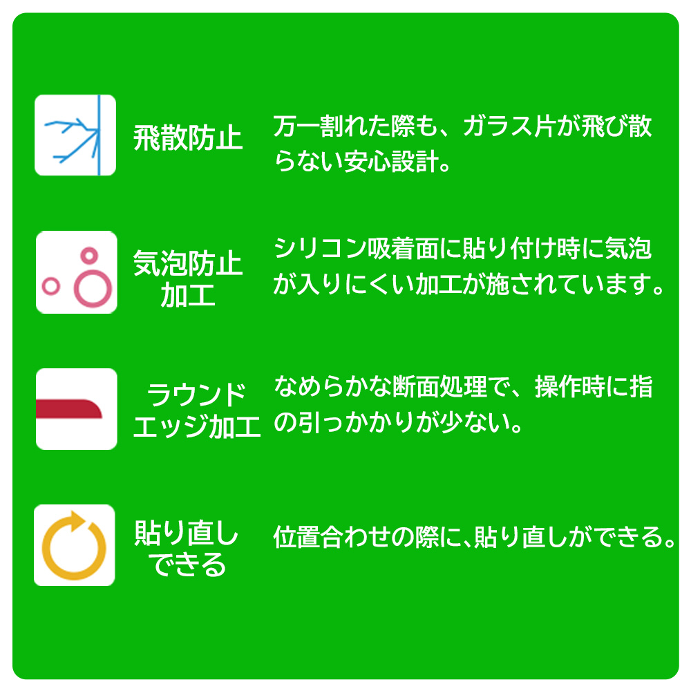 シリコン吸着面に貼り付け時に気泡が入りにくい加工が施されています。