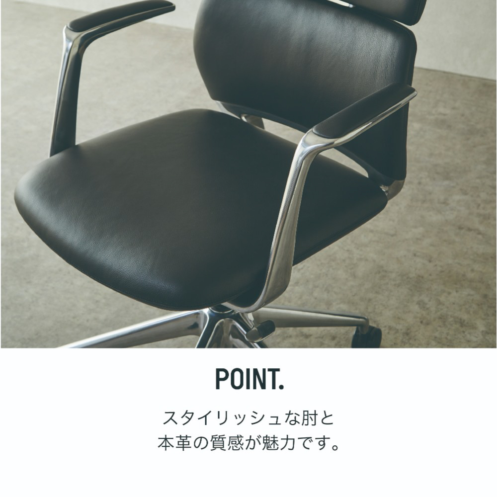 座面と背面の前面には本革を採用し、エグゼクティブなオフィス空間や落ち着きのある書斎に美しく調和します。