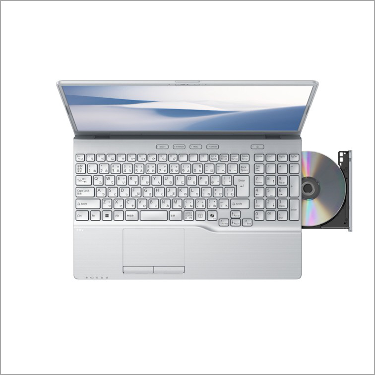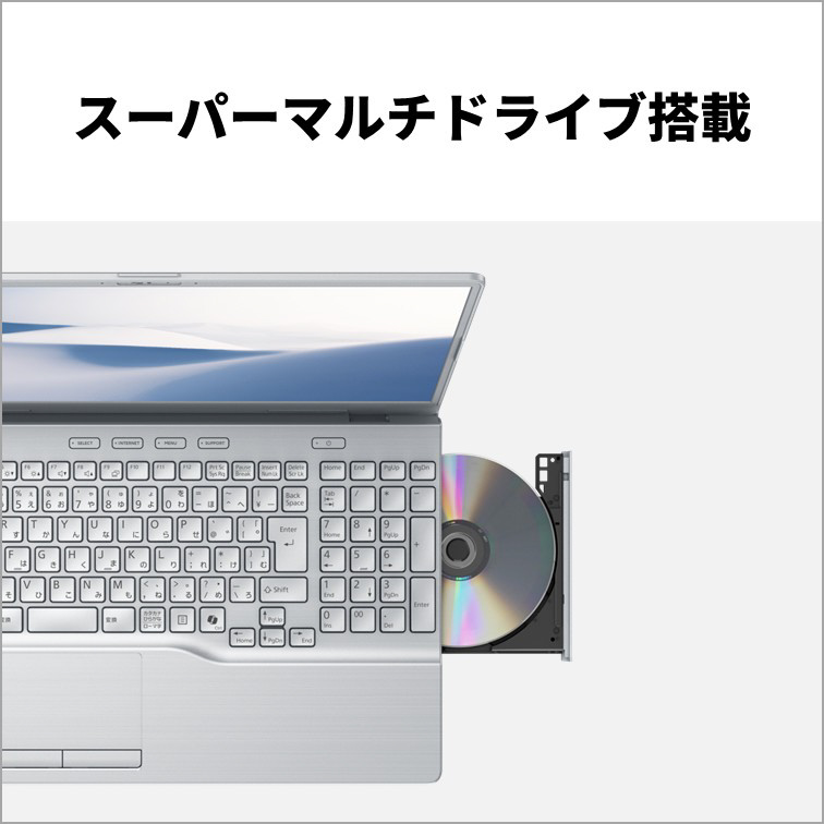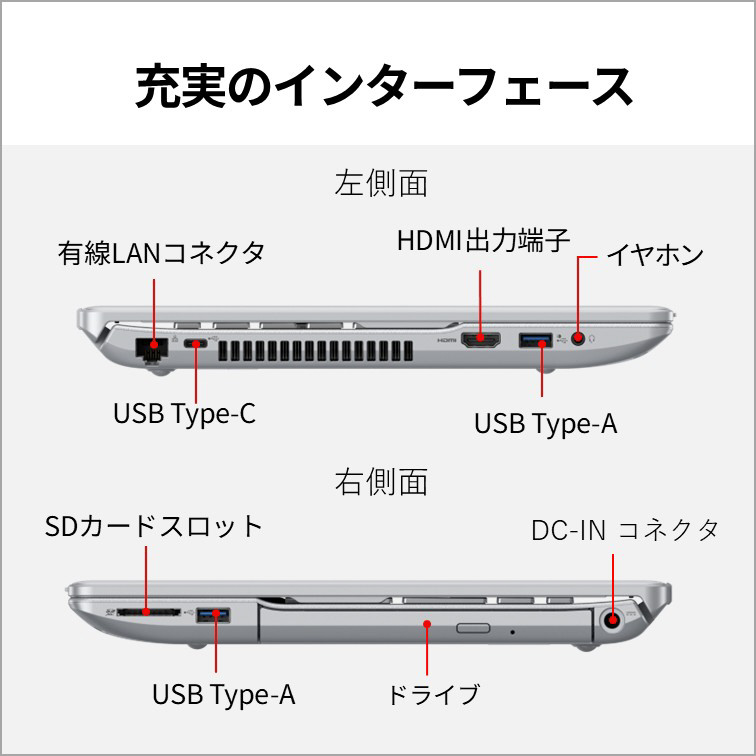 メインパソコンにふわしい、有線LANポートやUSBポートなどの充実のインターフェースを装備。もちろん光学ドライブも搭載しているのでDVDでのデータの保存や視聴も可能です。