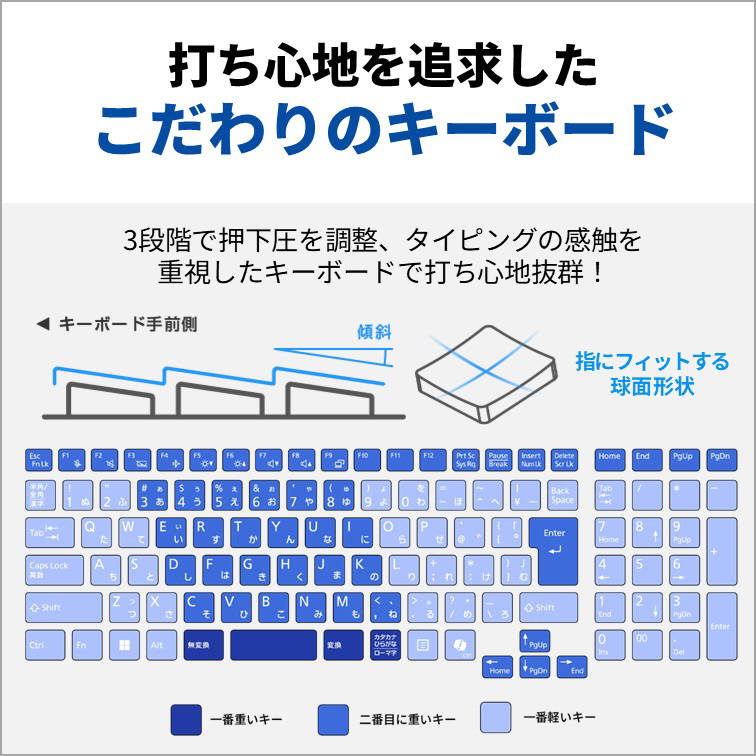 打ち間違い防止に「約18.4mmキーピッチ」、打ち心地の良い「約2.5mmキーストローク」、指の力に合わせてキー入力の重さを調整した「3段階押下圧」により、快適な文字入力を実現。