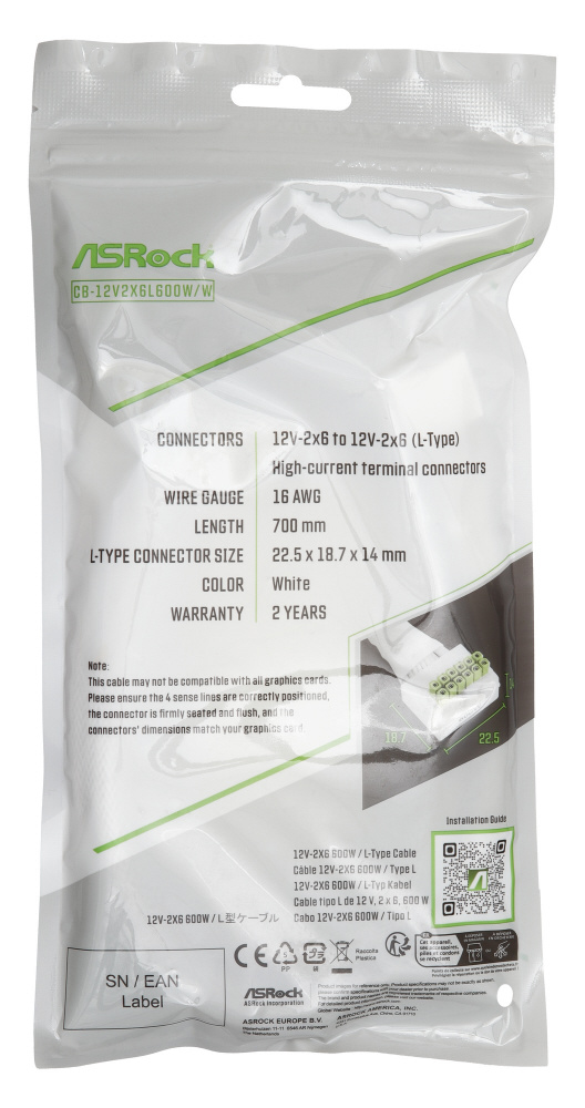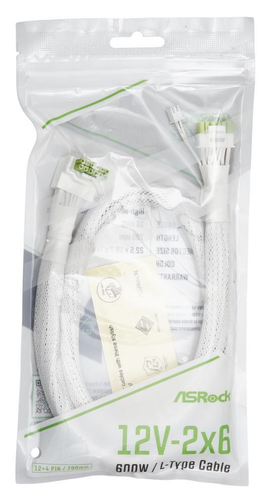 ASRock社製電源ユニット用 モジュラーケーブル ASRock 12V2x6 L型コネクタ ホワイト CB-12V2X6L600W/W