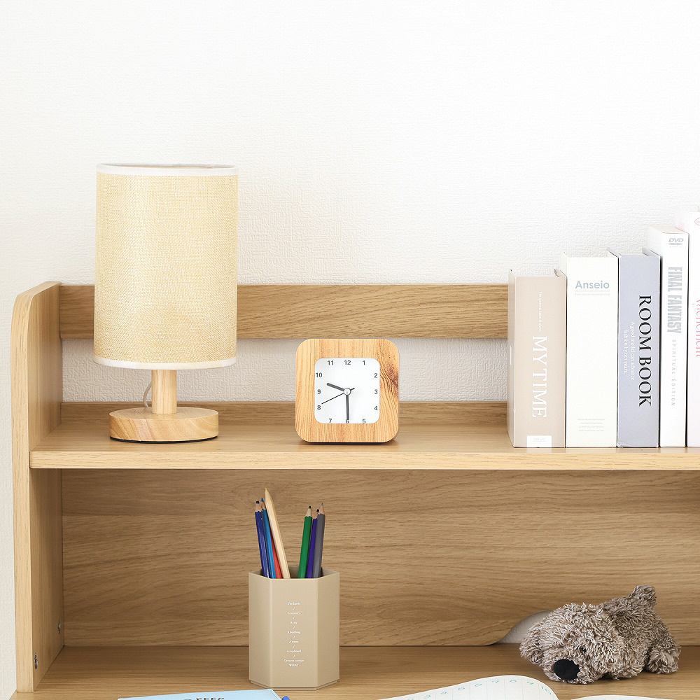 よく使う文房具や教材をまとめて置ける上棚と、小物引き出しを装備。出し入れしやすい設計で、自然と片付けの習慣が身につきます。