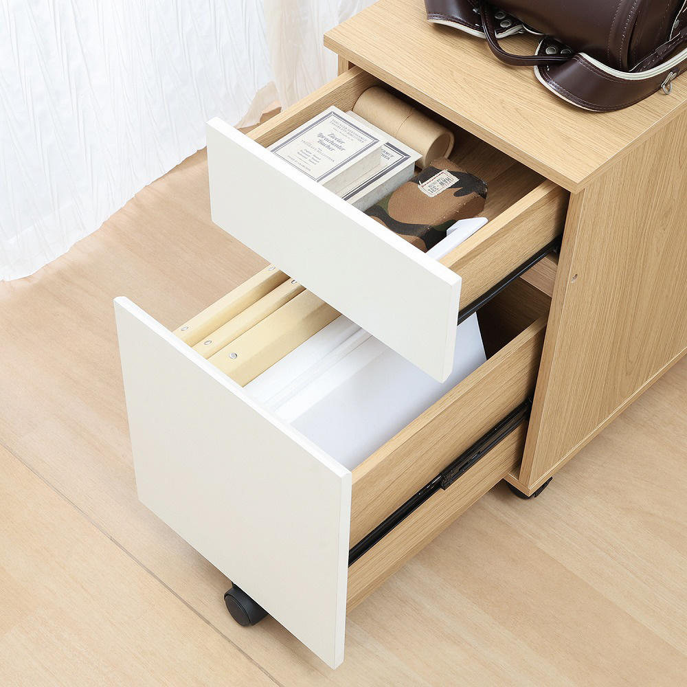 引き出しはスチールレールでなめらかに開閉。教科書や作品はもちろん、おもちゃもたっぷり収納できるキャビネットです。