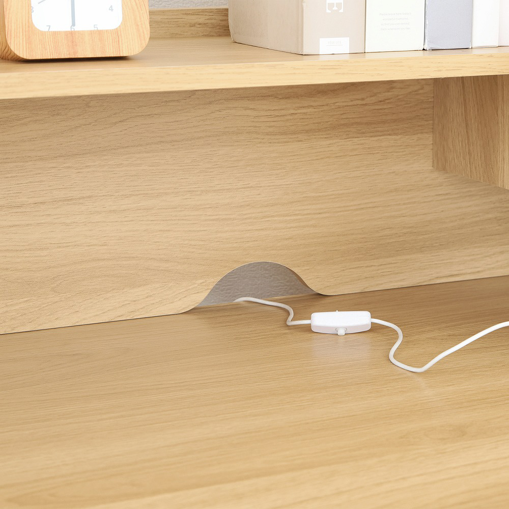 上棚と天板の間にコード穴を設け、コンセント周りをすっきりまとめられる設計。タブレット学習やライト使用時も快適です。
