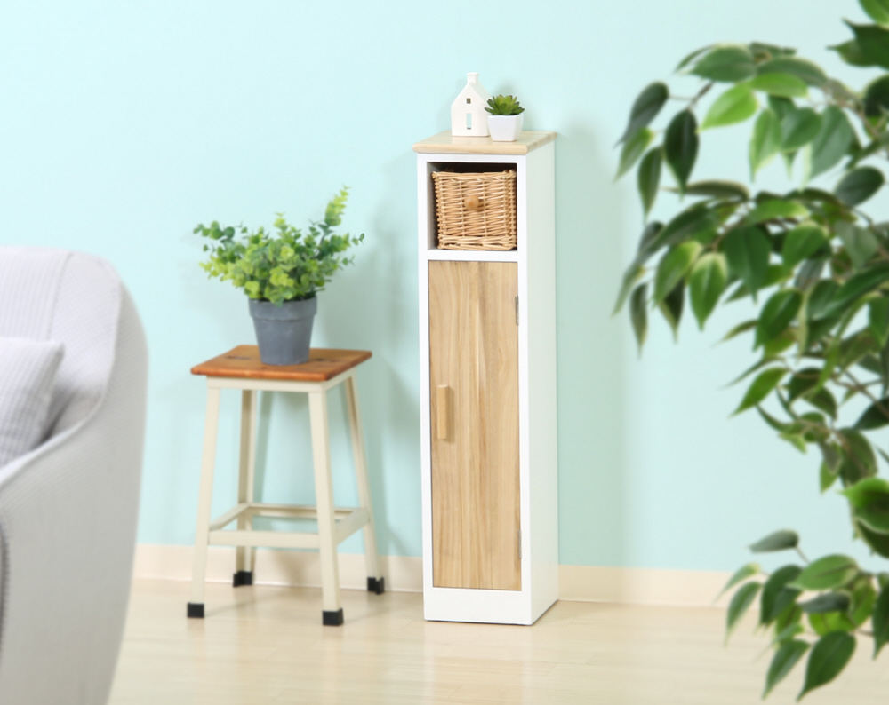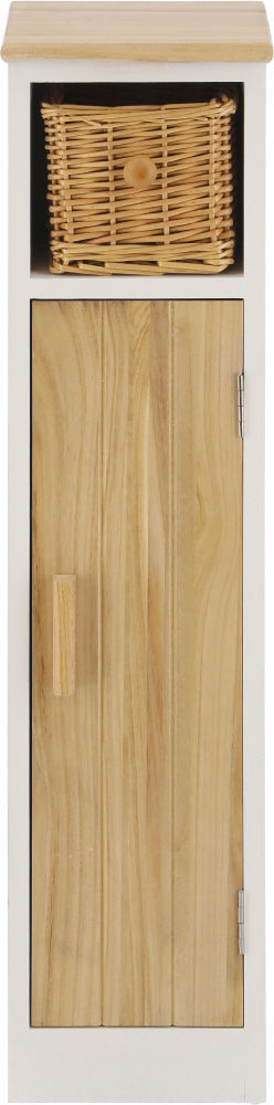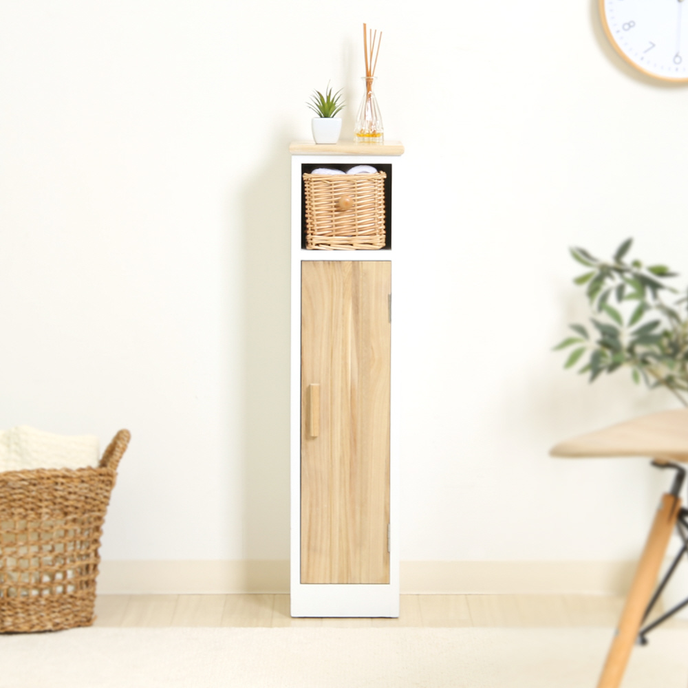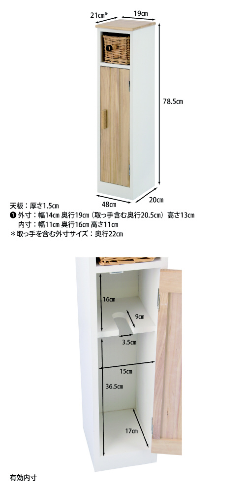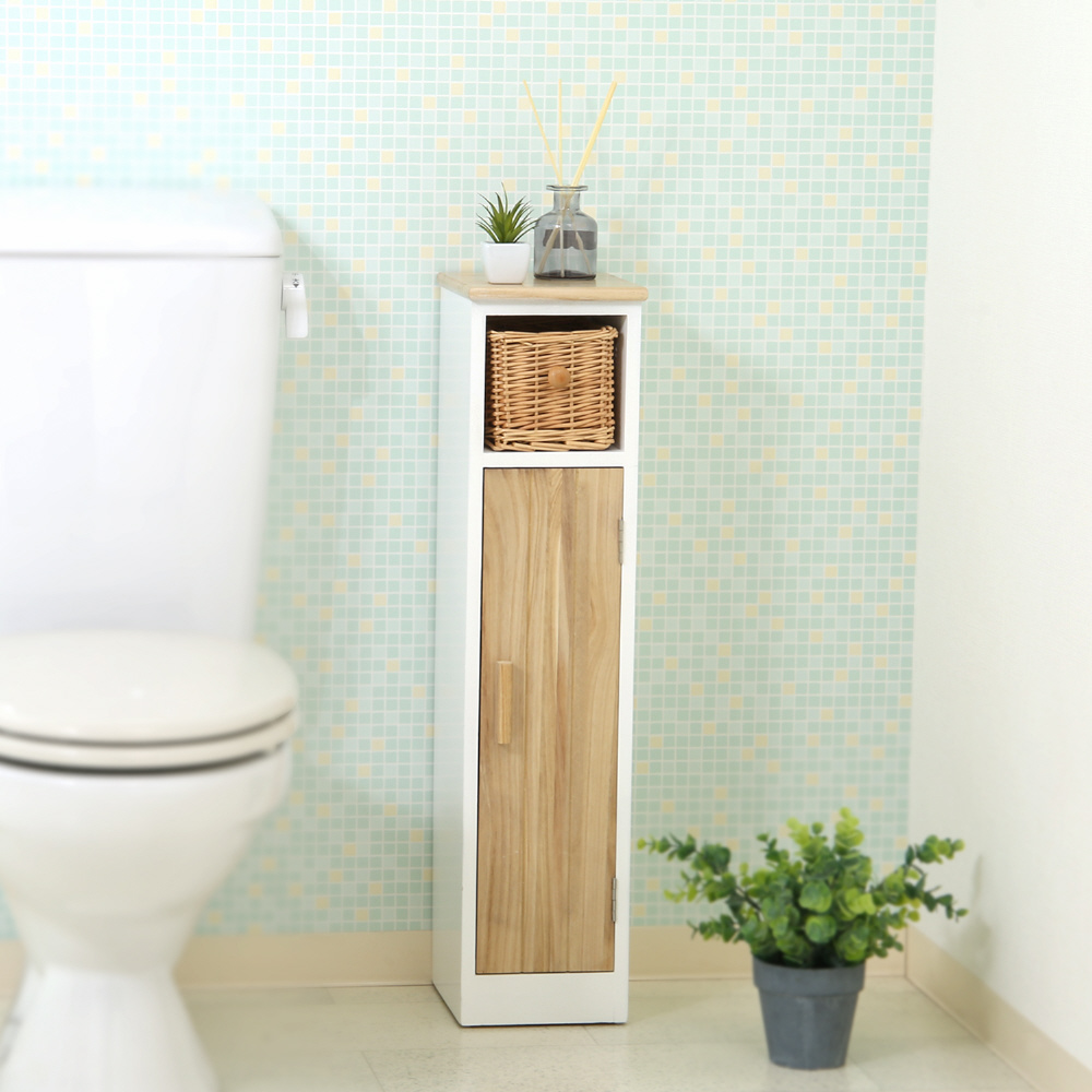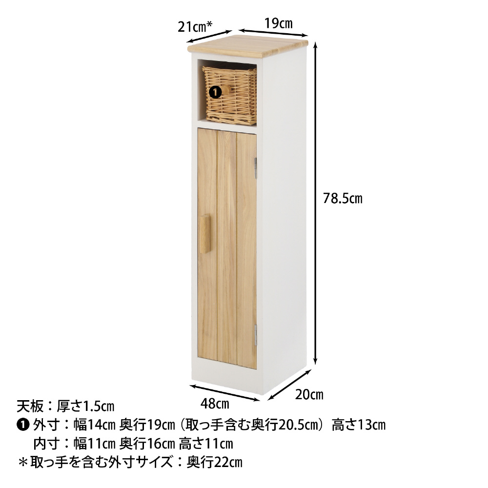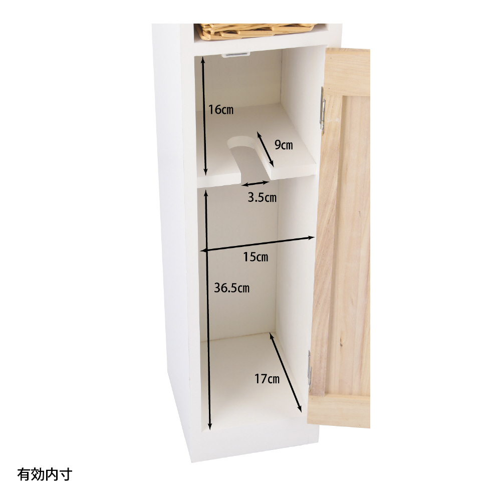 扉収納部の内寸は幅15×奥行17×高さ54cm。かごも使えば最大5個のトイレットペーパーが収まります。(かご内寸幅11×奥行16×高さ11cm)