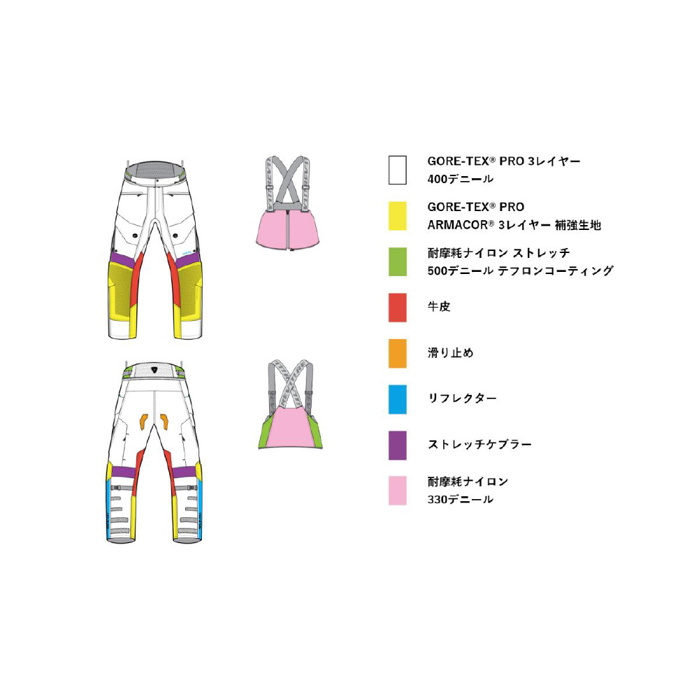 その他機能:ジャケット接続用ファスナー(ショート/ロング)、滑り止めグリップパネル、防水ポケット、着脱式サスペンダー、調整式ひざプロテクター、マグネット式ベンチレーションカバー、プロテクションプリント