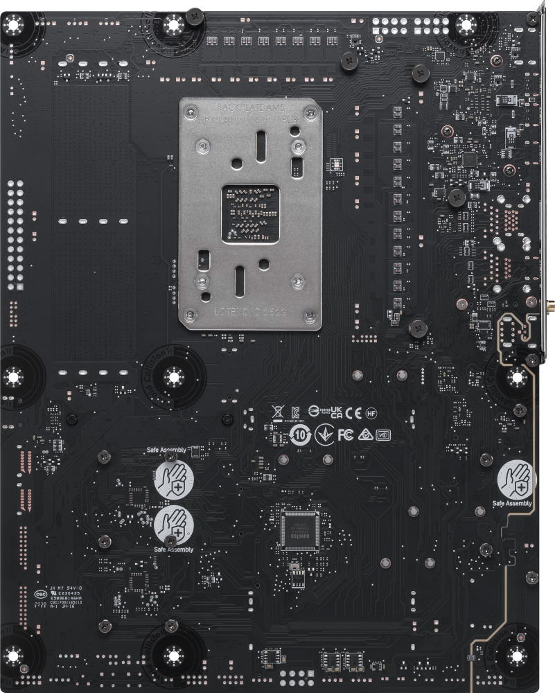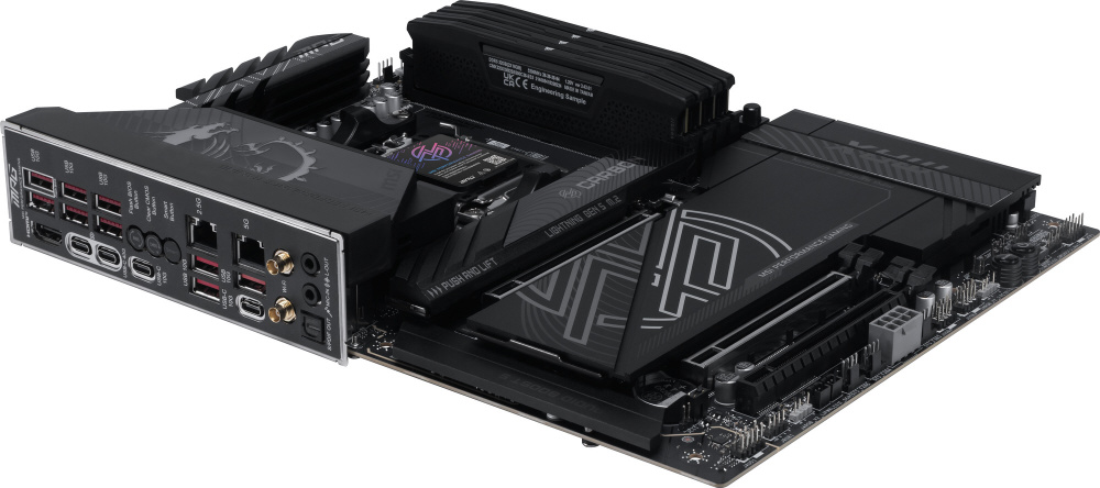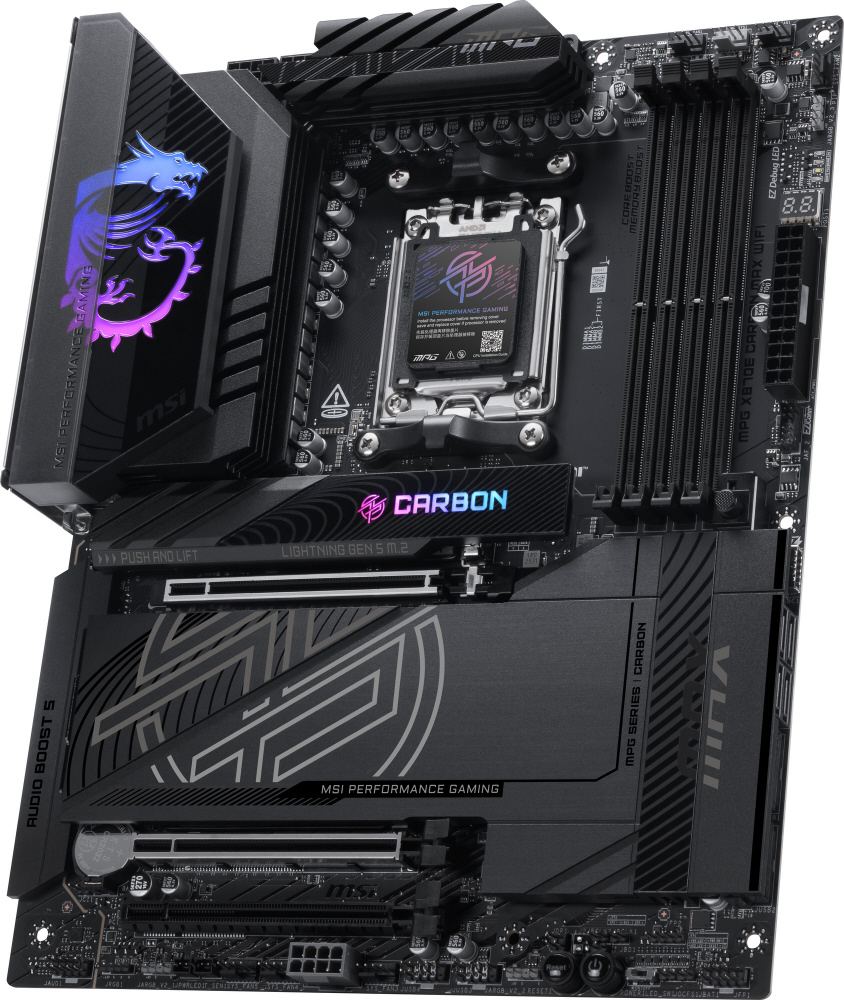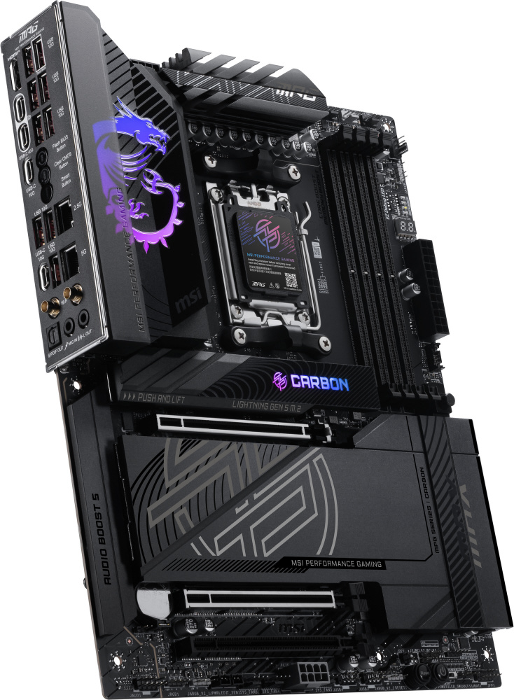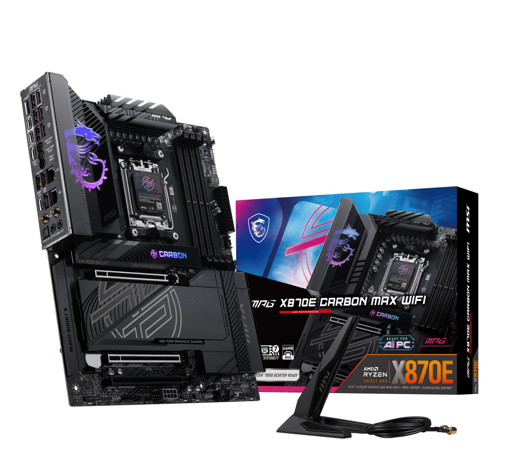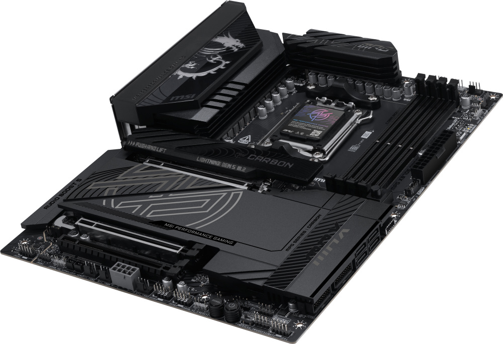 AMD X870Eチップセット搭載。カーボンブラックのボードカラーを採用しLEDライティングを備えたATXマザーボード