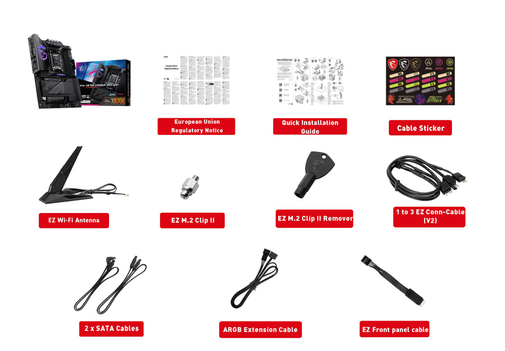 付属品 クイックインストールガイド、EZ Wi-Fiアンテナ、SATA Cable×2、EZ M.2 Clip II×2、EZ M.2 Clip II Remover、1 to 3 EZ Conn-Cable(V2)、ARGB Extension Cable、EZ Front Panel Cable、ケーブルステッカー