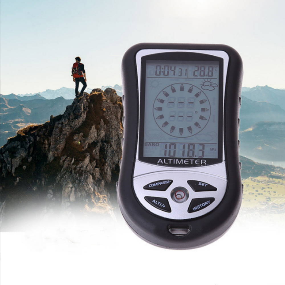コンパス、温度計、気圧計、デジタル高度計、天気予報、時間表示、カレンダーの多機能搭載のデジタルコンパス