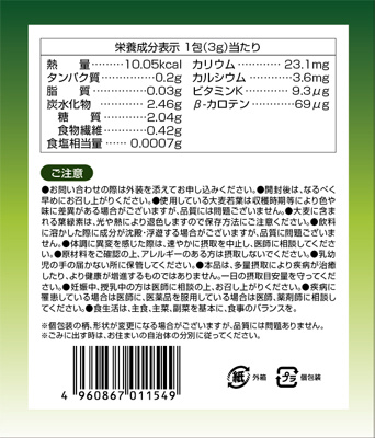 原材料 大麦若葉末、マルトデキストリン、ぶどう糖、難消化性デキストリン