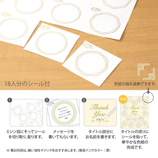 簡単に寄せ書きできると大好評の「シール付き色紙」。色紙中央に箔押しでデザインされたタイトルを囲むようにシールを貼っていくだけで、美しい色紙が完成します。箔押しを施した半透明シールと、色紙(いろがみ)の表情で上質な雰囲気に仕上がります。