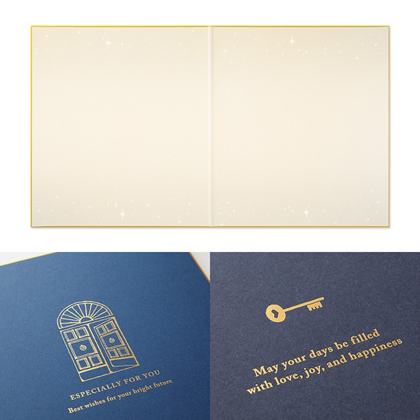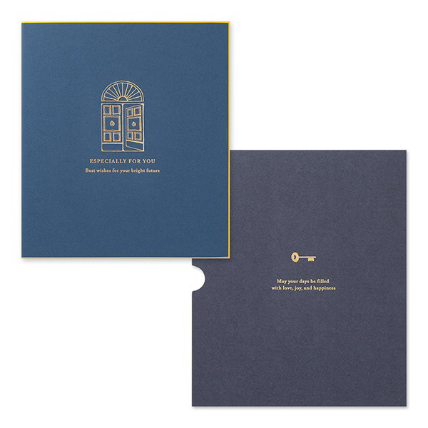 表情のある紙に金箔で扉のモチーフを施した、人生の門出を祝うのにぴったりのデザインの色紙です。ハッピーモチーフのシールも色紙を賑やかに彩ります。付属のスリーブケースに入れることで、手軽ながら丁寧に気持ちを届けられます。