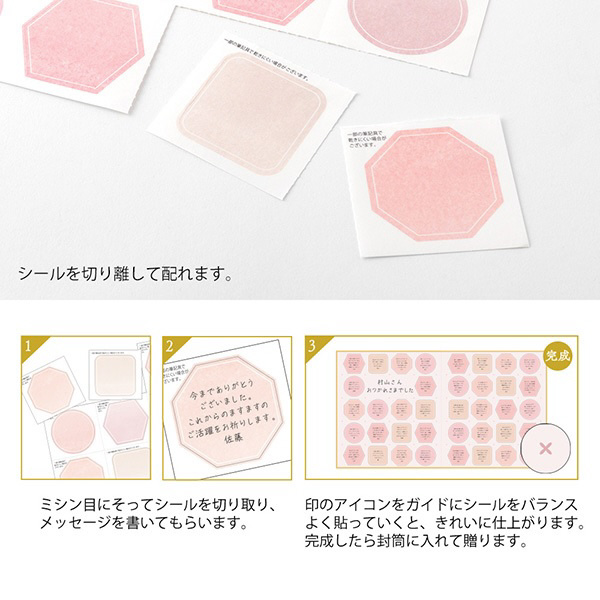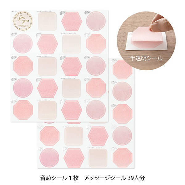 半透明シールは39枚入り。メッセージを記入してもらい、回収するだけなので多人数の寄せ書きも簡単に作ることができます。