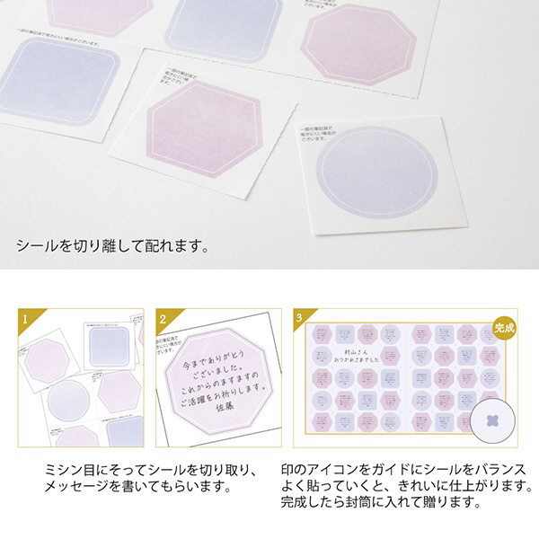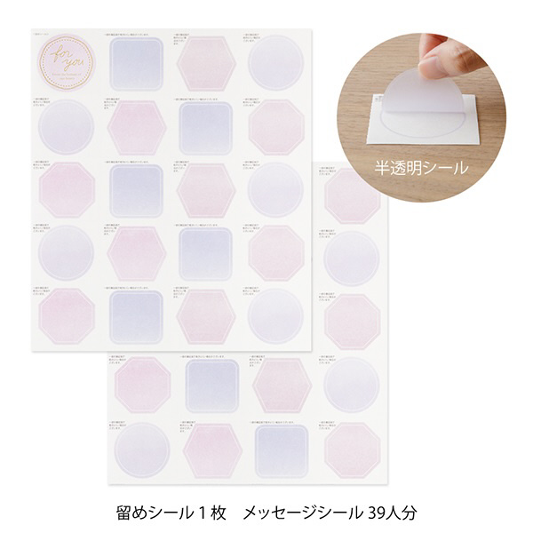 半透明シールは39枚入り。メッセージを記入してもらい、回収するだけなので多人数の寄せ書きも簡単に作ることができます。