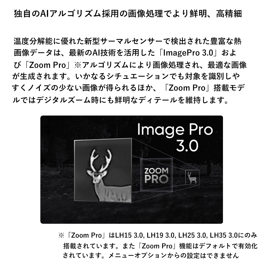 温度分解能に優れた新型サーマルセンサーで検出された豊富な熱画像データは、最新のAI技術を活用した「ImagePro 3.0」および「Zoom Pro」※アルゴリズムにより画像処理され、最適な画像が生成されます。いかなるシチュエーションでも対象を識別しやすくノイズの少ない画像が得られるほか、「Zoom Pro」搭載モデルではデジタルズーム時にも鮮明なディテールを維持します。※「Zoom Pro」はLH15 3.0, LH19 3.0, LH25 3.0, LH35 3.0にのみ搭載されています。また「Zoom Pro」機能はデフォルトで有効化されています。メニューオプションからの設定はできません。