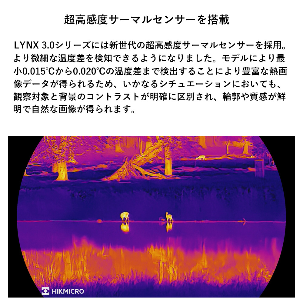 LYNX 3.0シリーズには新世代の超高感度サーマルセンサーを採用。より微細な温度差を検知できるようになりました。モデルにより最小0.015℃から0.020℃の温度差まで検出することにより豊富な熱画像データが得られるため、いかなるシチュエーションにおいても、観察対象と背景のコントラストが明確に区別され、輪郭や質感が鮮明で自然な画像が得られます。