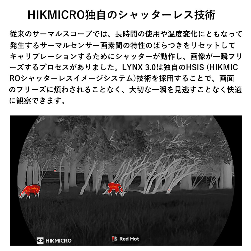 従来のサーマルスコープでは、長時間の使用や温度変化にともなって発生するサーマルセンサー画素間の特性のばらつきをリセットしてキャリブレーションするためにシャッターが動作し、画像が一瞬フリーズするプロセスがありました。LYNX 3.0は独自のHSIS (HIKMICROシャッターレスイメージシステム)技術を採用することで、画面のフリーズに煩わされることなく、大切な一瞬を見逃すことなく快適に観察できます。