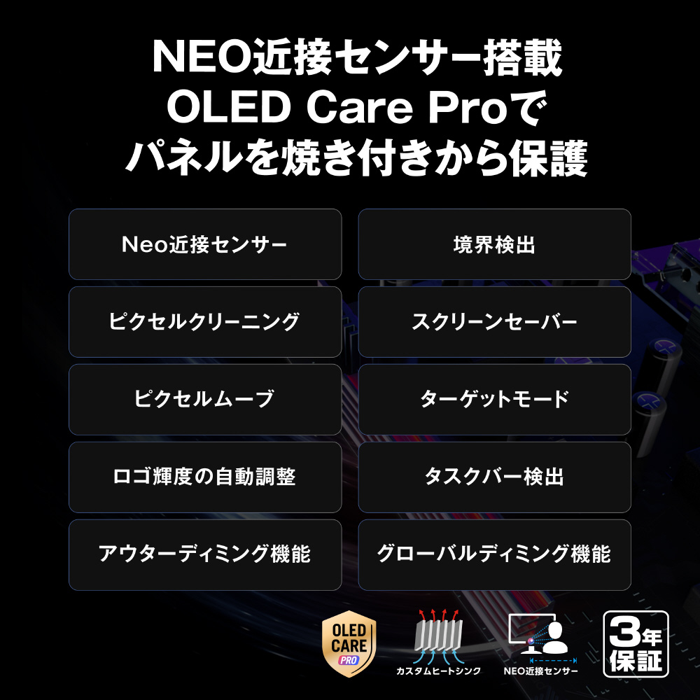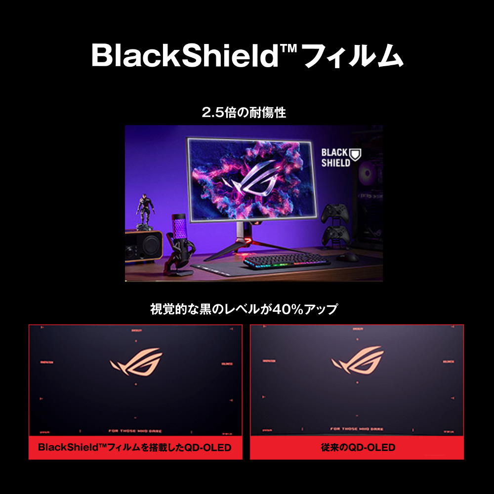 BlackShieldフィルムはパネルの硬度を高め、既存のQD-OLEDパネルの2.5 倍の耐傷性を実現します。この革新的なフィルムは、クリーニングや取り扱いの際の偶発的な擦り傷からディスプレイをしっかりと保護。モニターの寿命を延ばし、安心してお使いいただけます。