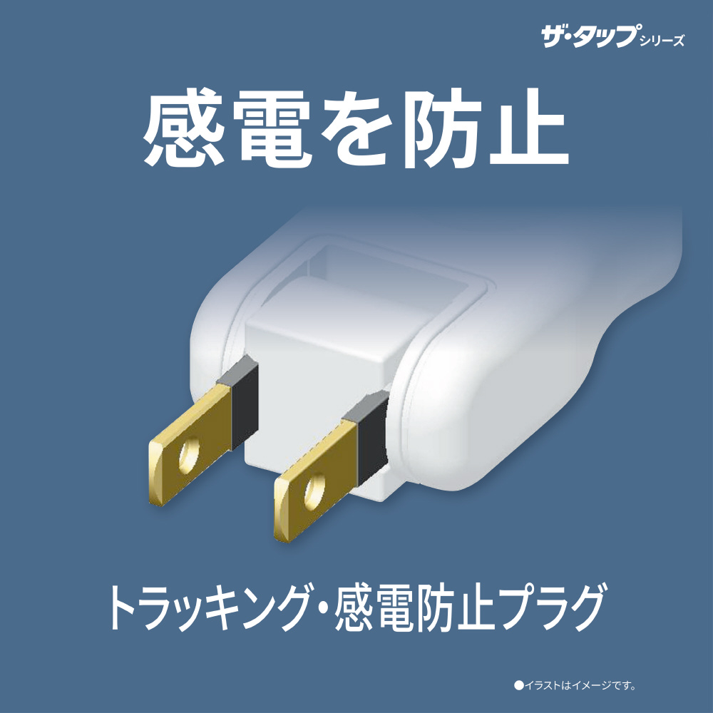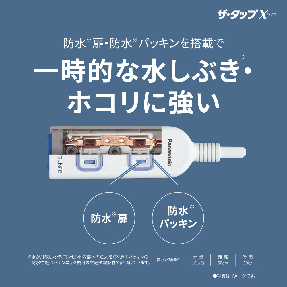 ■世界初(2006年1月12日発表。テーブルタップの中でナショナル社調べ)一時的な水しぶき・ホコリの侵入をガードする「防水扉(水が飛散した時、コンセント内部への浸入を防ぐ扉+パッキンの防水性能はナショナル社独自の試験条件で評価)」付。