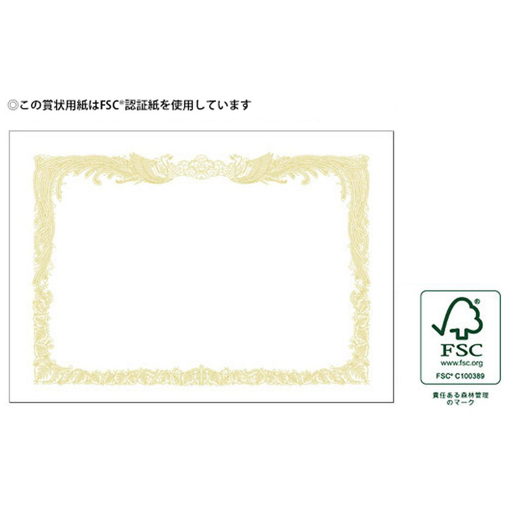 美しい金色の輝きを保つ特殊印刷をした賞状です。新たな印刷技法を用いているのでレーザープリンタやその他の出力機に対応しています。賞状用紙にふさわしい気品と深みのある風格が縁飾りに表現されています。従来からの手書きや通常印刷(凸版やオフセット)にも使用できます。幅広い用途のベーシックなホワイトベース。縦書き用(横型)です。業務用100枚仕立て。