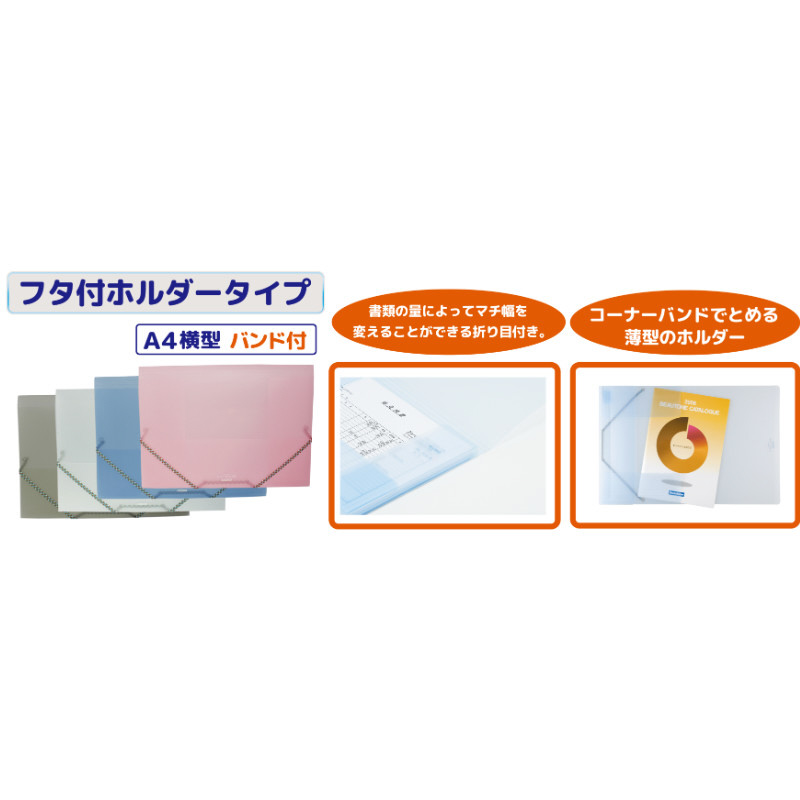 コーナーバンドで留める薄型のホルダー、書類の量によってマチ幅を変えることができる折り目付き