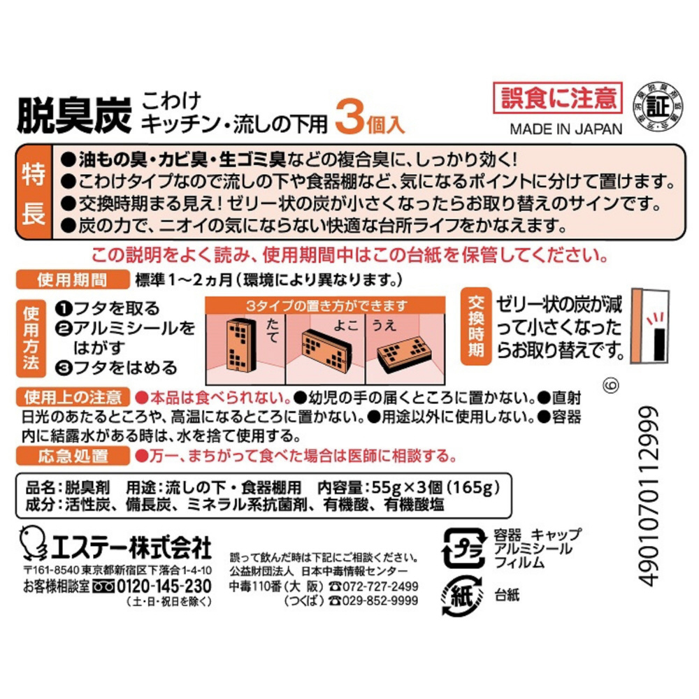 脱臭炭 こわけ キッチン・流しの下用 脱臭剤 55g×3個入