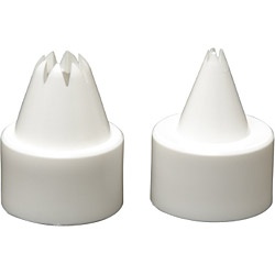 先端が8箇所カットされた大サイズ(花8切)と、5箇所カットされた小サイズ(星5切)をセット。ホイップの達人に付属するしぼり口(中サイズ・星6切)とあわせれば多彩な表現が楽しめます。