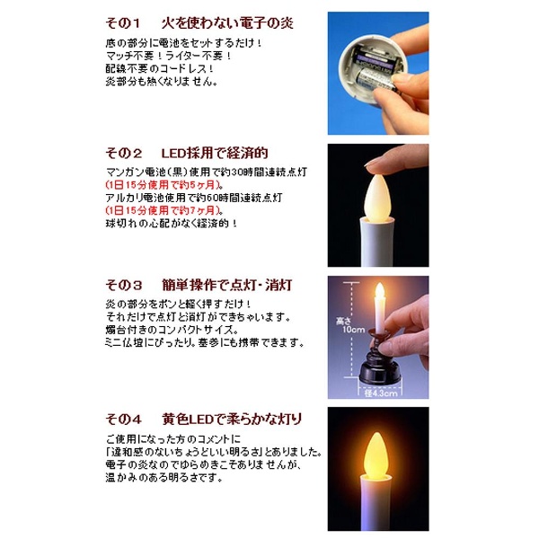 ■マッチ、ライター、配線不要。火を使わない電子の炎で、倒れても安全なろうそくです。