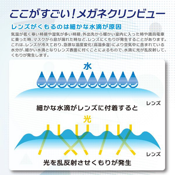 ●特殊くもり防止剤でくもり止め効果が長続きします。マスク使用等のメガネのくもりを防ぎます。