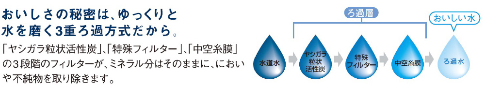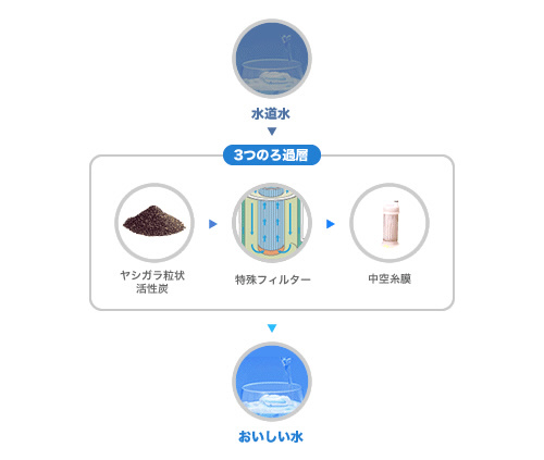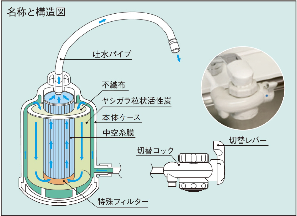仕様1 ろ材の種類:ヤシガラ粒状活性炭(鉛除去剤配合)、特殊フィルター、中空糸膜