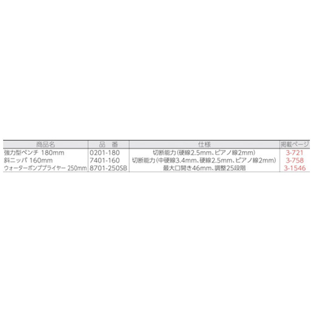 ・0201-180: 全長180mm、切断能力(硬線2.5mm、ピアノ線2mm)