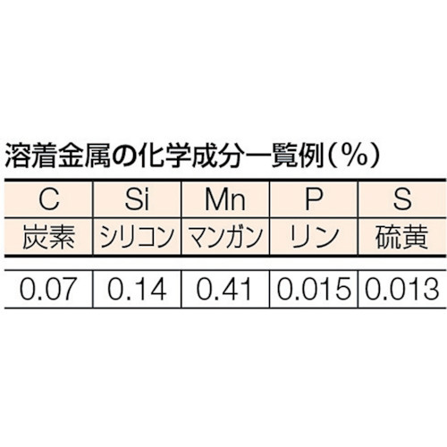 ■被覆剤中に約30%の鉄粉を含有したライムチタニヤ系溶接棒で、再アーク性に優れ、ビード伸びも良く、断続溶接、すみ肉溶接、タック溶接(仮付け)など全姿勢で溶接できます。