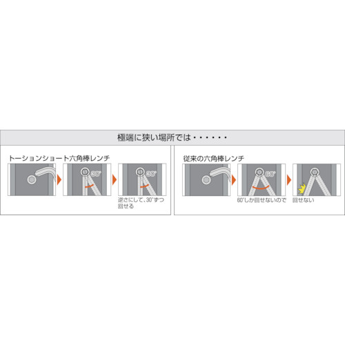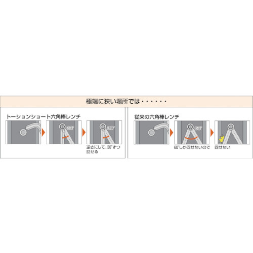 ■レンチを両口にしてなお左右で対辺曲げと対角曲げにしてありますので間口の狭い場所での使用に最適です。(30°使用可能)