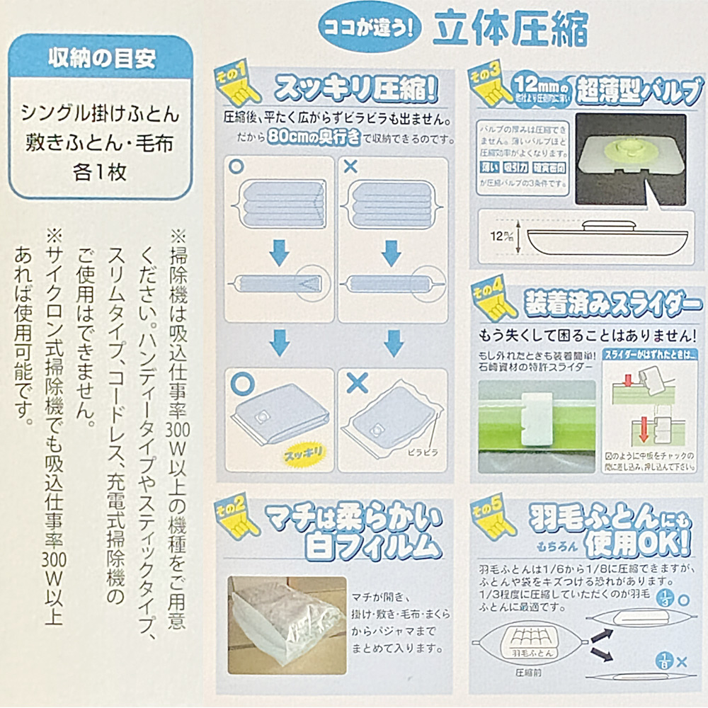 シングルサイズの掛けふとん、敷ふとん、毛布が各1枚まとめて入ります。