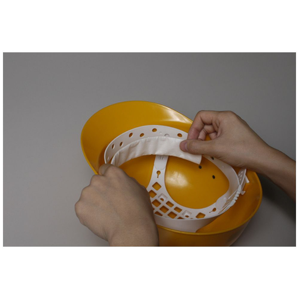 ヘルメットや帽子の額が当たる部分に貼り、汗を速やかに吸収します。