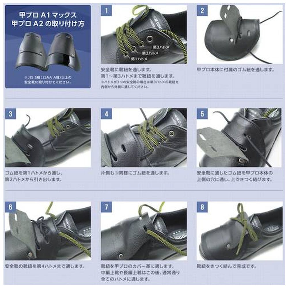 ■落下物から足の甲部を守る取り外し可能な、ひも靴用甲プロテクタです。